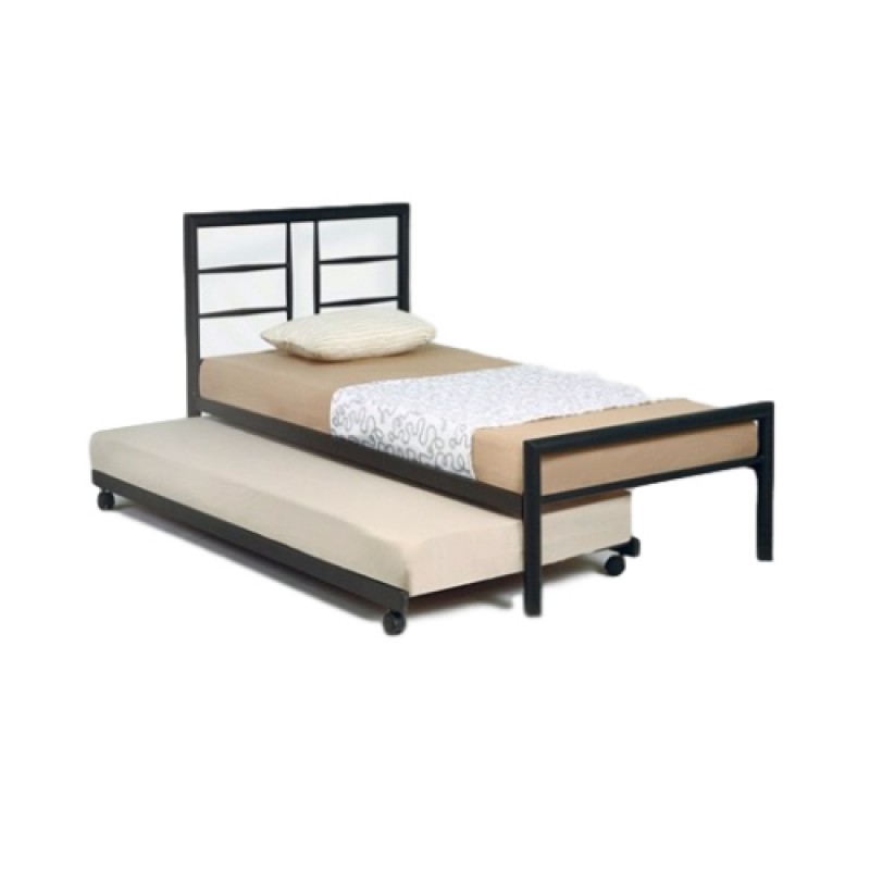 SINGLE METAL BED FRAME WITH TRUNDLE FOR MORE SLEEPING SPACE.